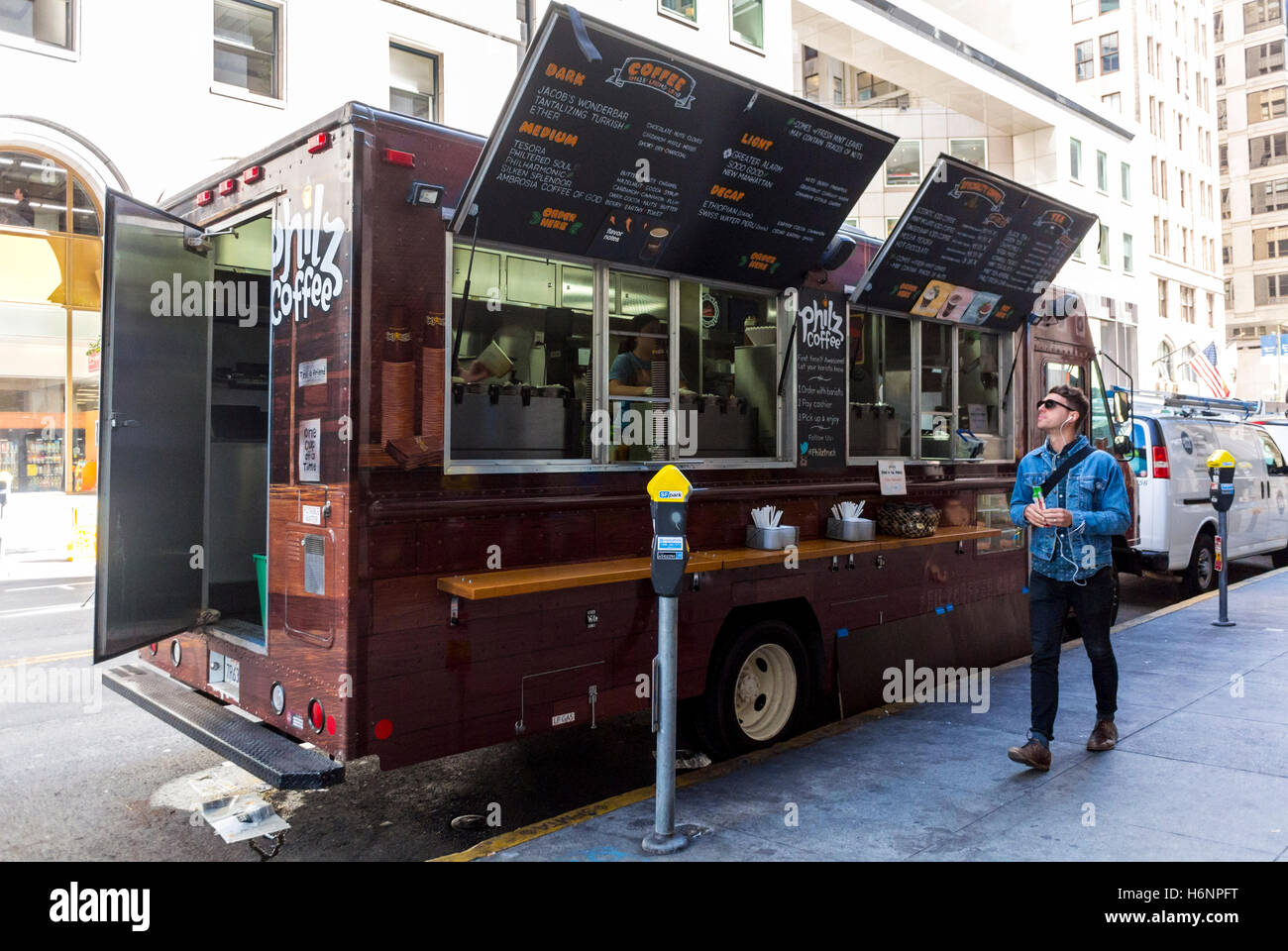 San Francisco Ca Usa Man Walking By Street Vendor Food Trucks Philz Coffee Daytime Stock Photo Alamy